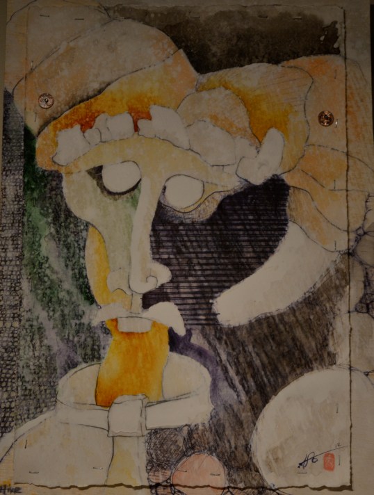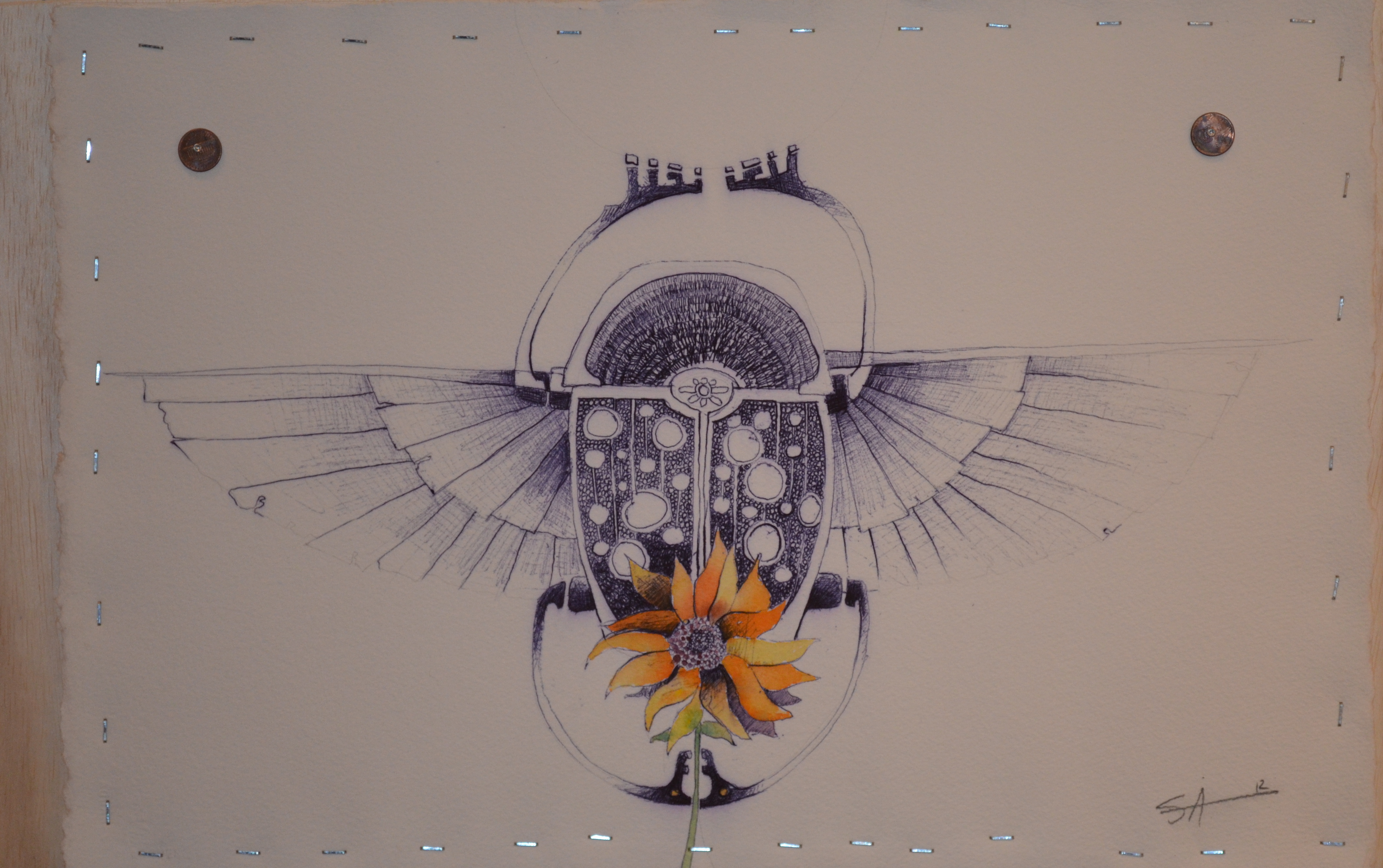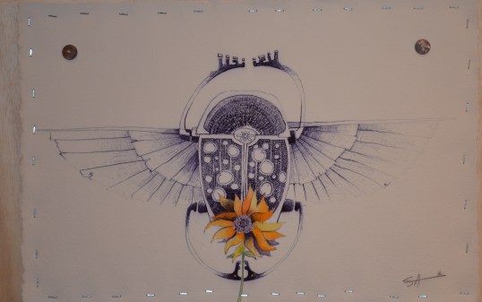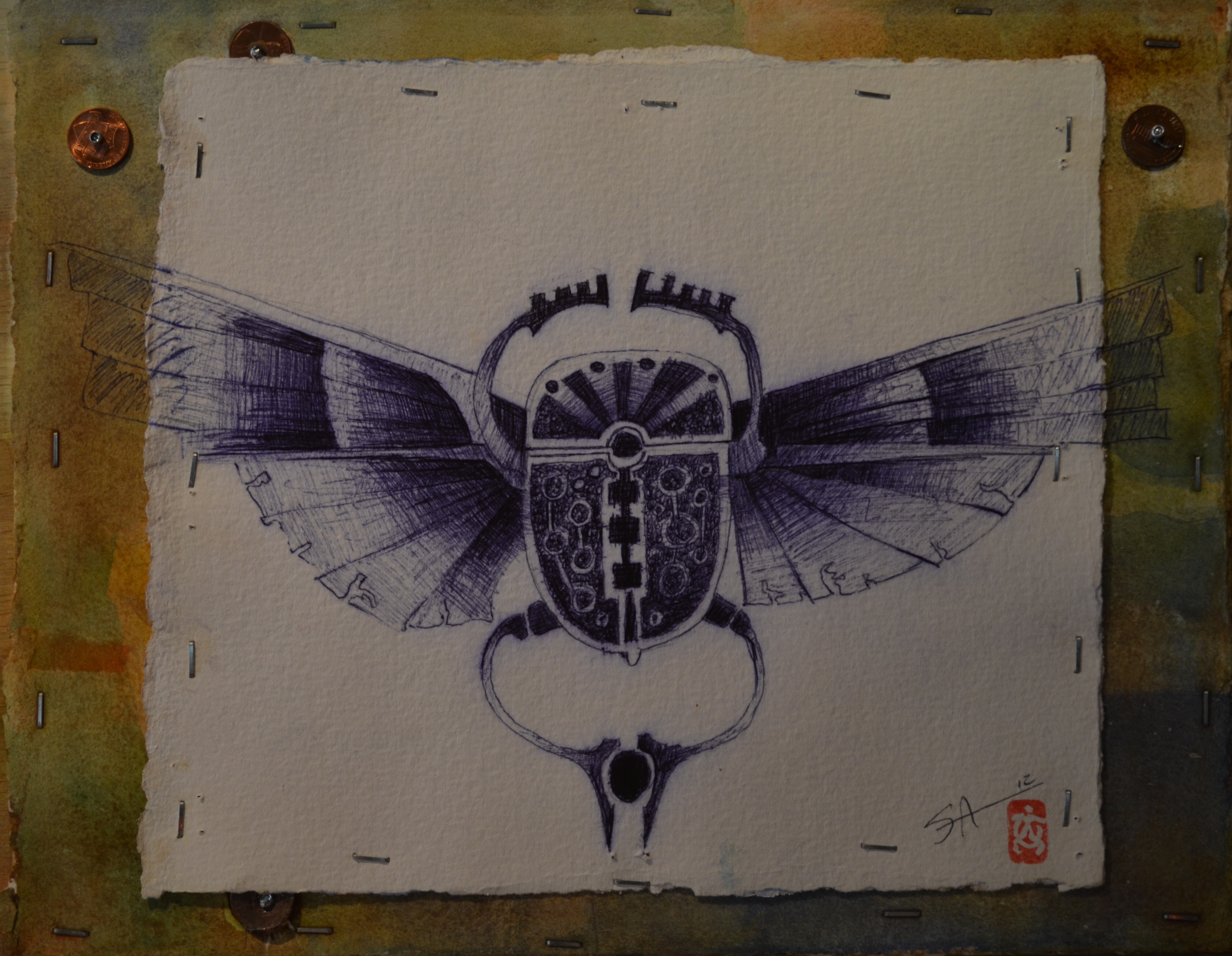 This is a drawing of an Egyptian scarab, the symbol of self creation. Ironically the scarab is also a dung beetle. An unlikely hero in todays culture. I really like this juxtaposition and implied humility. Drawn in ballpoint pen (a free artist material in the U.S.) and mounted on a sheet of plywood, makes this a particularly democratic work of art.