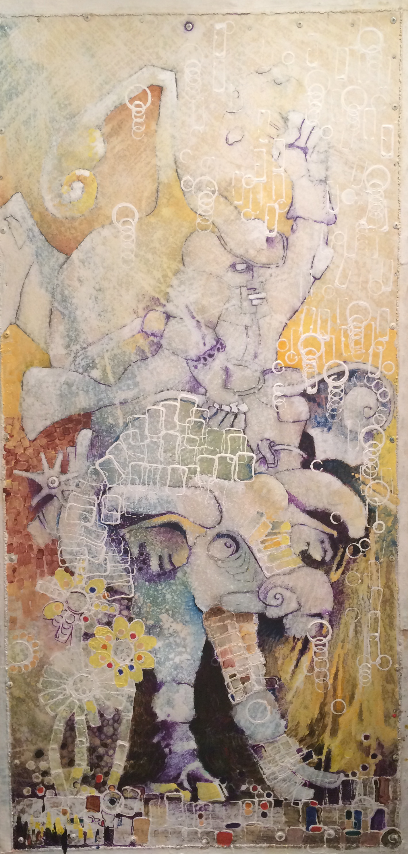 The painting is a watercolor 2.5’x5.0′ I sketched it in pencil then blocked in some color then gave it a once over with gesso. It created a nice starting point.