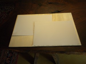 2. Create sheets of paper to cover the board in what ever fashion suits me. Often this is simple. One full sheet One half sheet. I typically use 300 lb Arches. I never cut the sheets. I crease and tear them, no sharp edges.