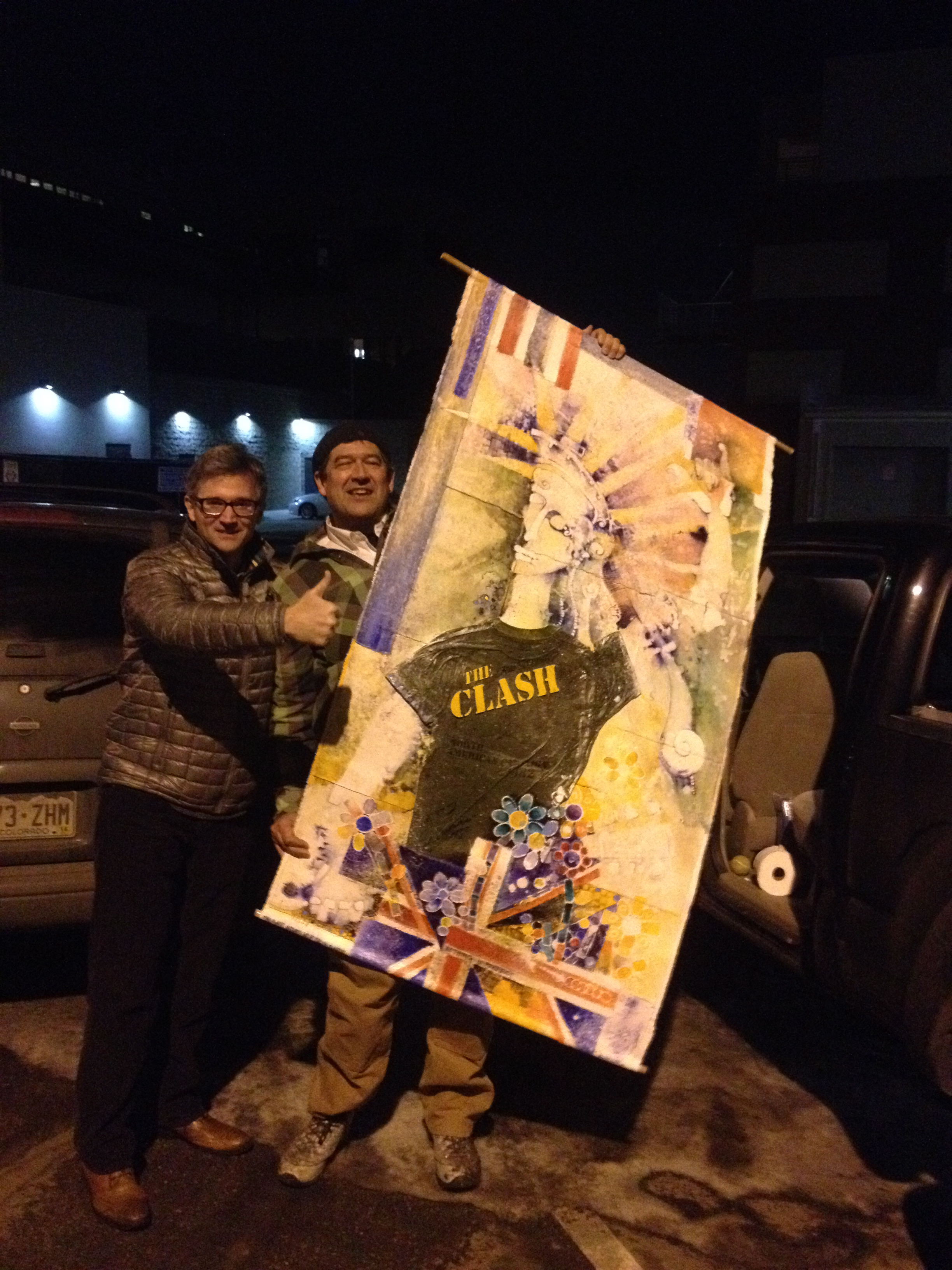 First I explode across the canvas with gesso (sticky white paint). This seems particularly appropriate with the Clash, although I have been doing this regularly for some yeas now. Perhaps that predilection is what attracted me to the Clash in the first place. After the gesso is dry, I soak the canvas. This allows some of the watercolor pigment which is lying around the gesso spatter to migrate a little. This effect is subtle but extremely important to me because it gives the work an inexplicable depth and luminosity.