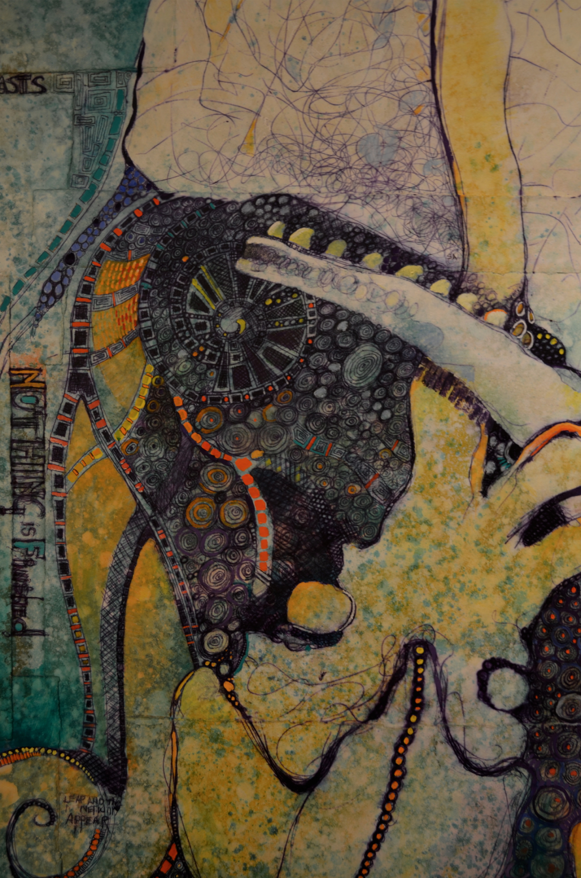 Ok A variety of things have taken place here. Partly because I did not take an intermediary photograph. First I abused the painting surface by splashing diluted gesso all over it. Some things got obscured. (you can see it splashed all over the t-shirt) I feel like this is an important step in the production of one of my paintings. It serves a number of functions. One it prevents attachment. Also it can highlight opportunity which can sometimes present its self because of random intervention. I find that random spatter mimics nature. In nature there is an infinite variety of overlay. This patina fascinates me. I seek it out in Art and Architecture.