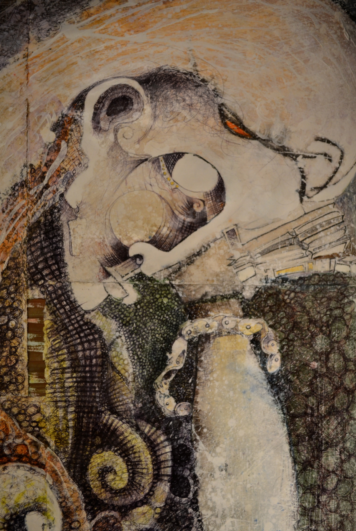 Hi viewers, Here is a detail of Always bigger fish. This painting is quite large. At 4 feet by 9 feet it represents a completely new path in watercolor for me. I intend to make this painting available in a more manageable size as a signed limited edition print. Price will be about $300. Feel free to call for other relevant details, 303-499-2099.