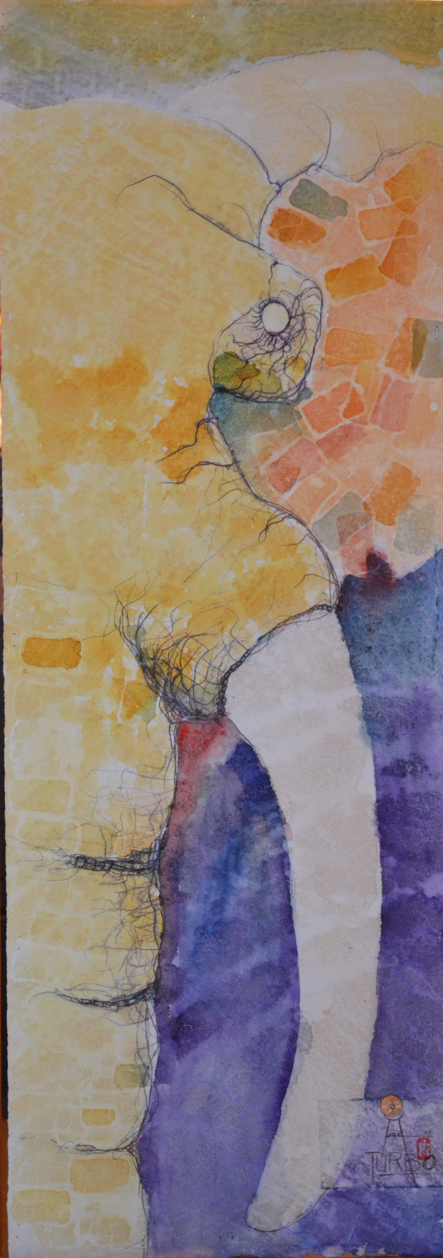 First I built the canvas which is multiple watercolor sheets glued to canvas roughly 3’wide by 5′-6″ tall. this is mounted on bamboo rods. I painted the back with gesso to give it some body and to protect against moisture. I also view this type of painting as an artifact. The gesso and canvas add to the substantial nature of this piece of art. When I am done it won’t be a delicate watercolor. More like a kick ass piece of canvas. Durable. Not requiring glass or protection. Art au-natural.